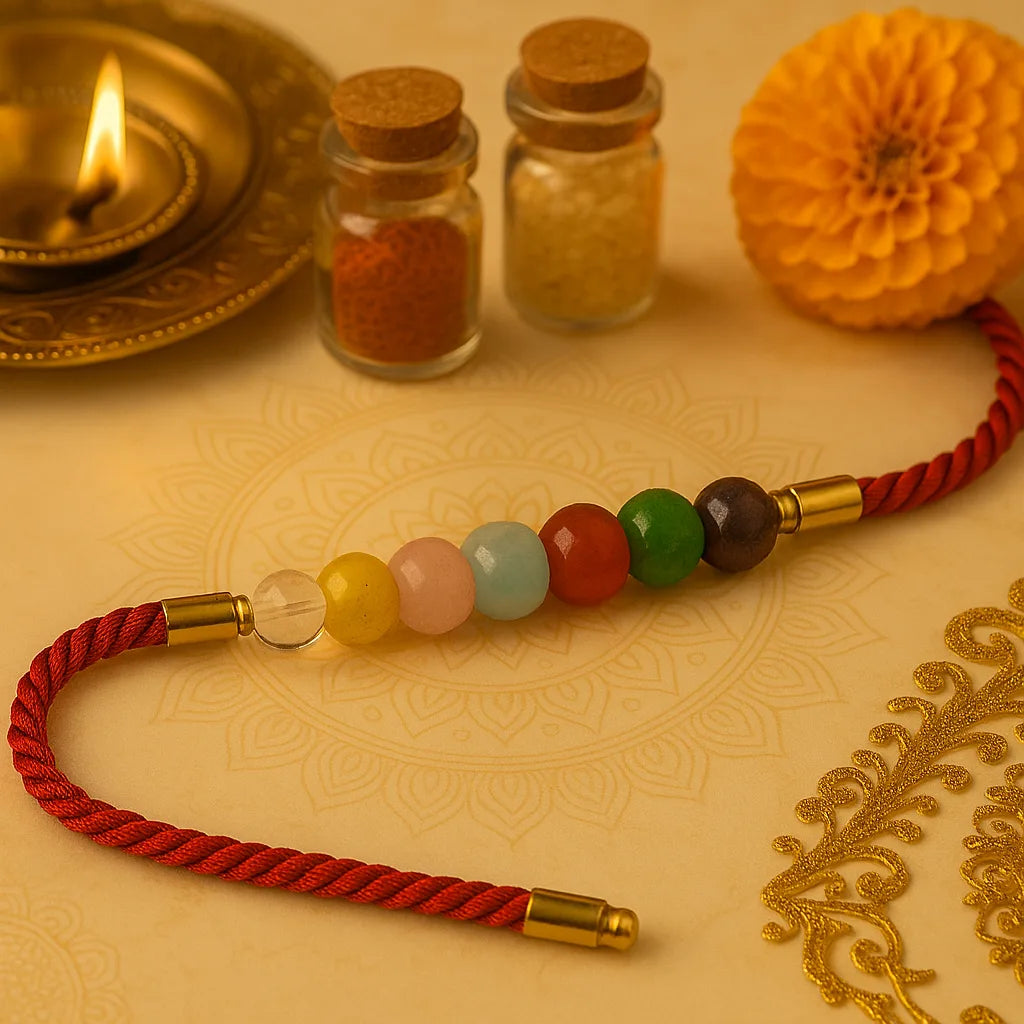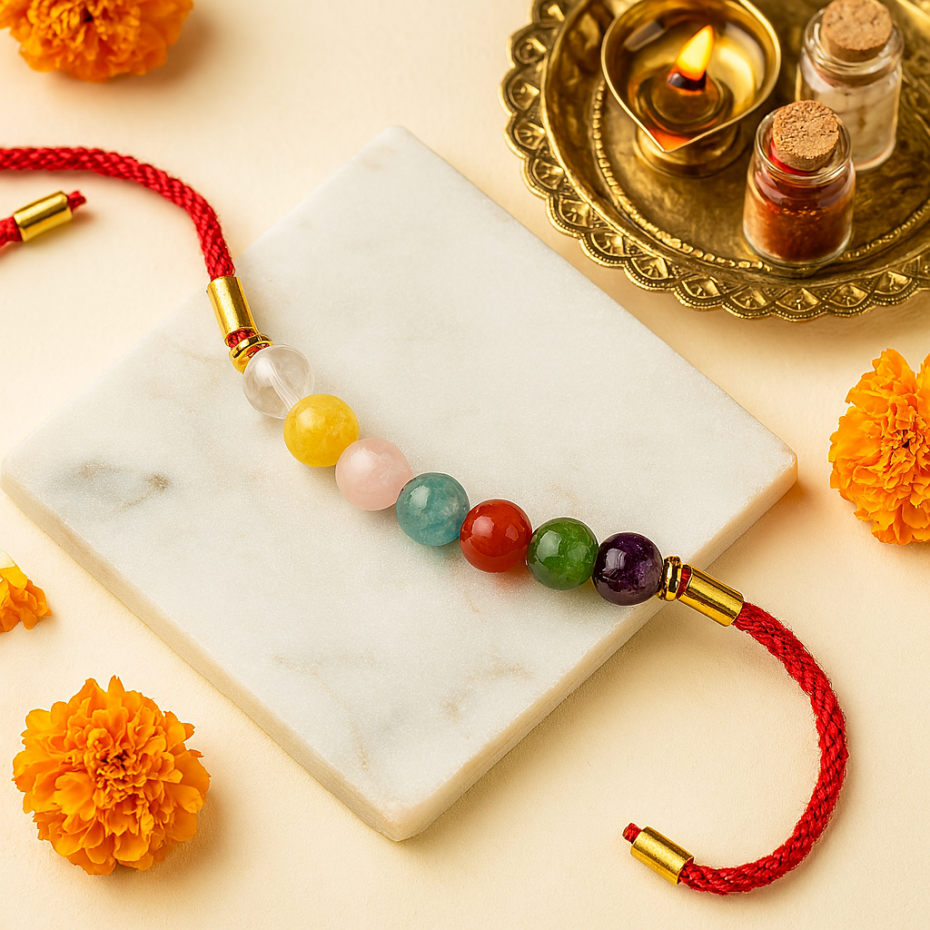 The 7 Chakra Rakhi is strung with 100% genuine, lab-certified healing stones, each chosen for a specific purpose — to protect his aura, balance his energy, and guide him with clarity through life’s highs and lows.