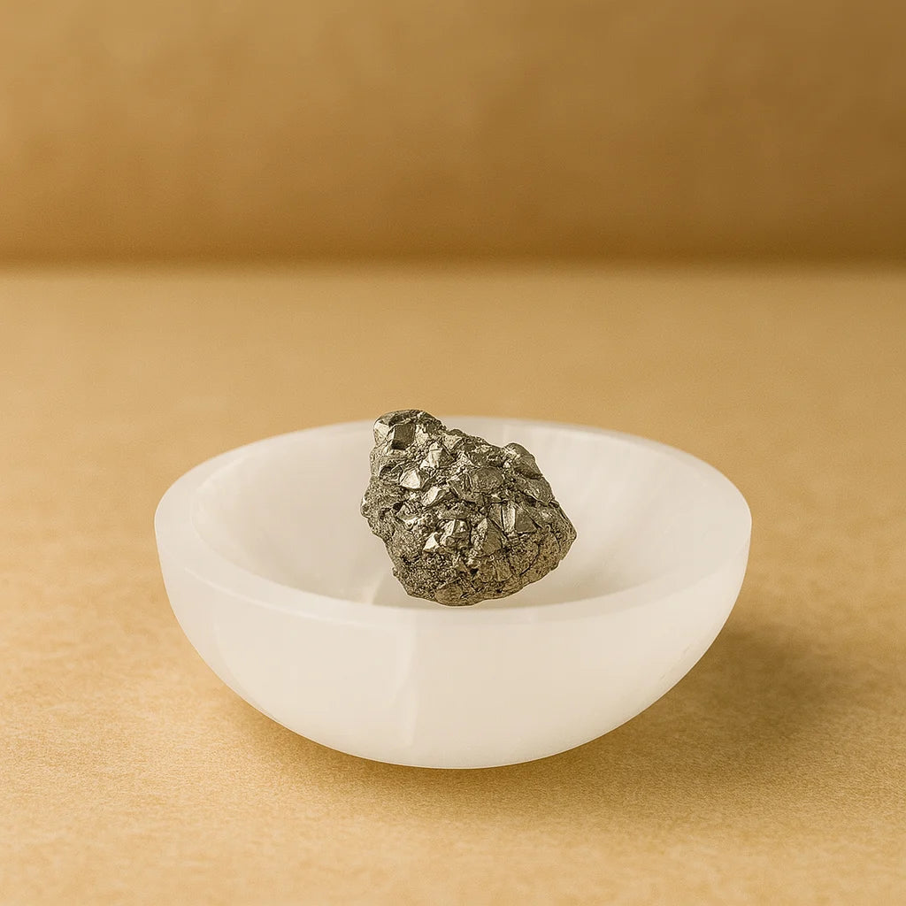 Material: AAA Raw Pyrite from Peru + Satin-Smooth Hand-Cut Selenite Plate